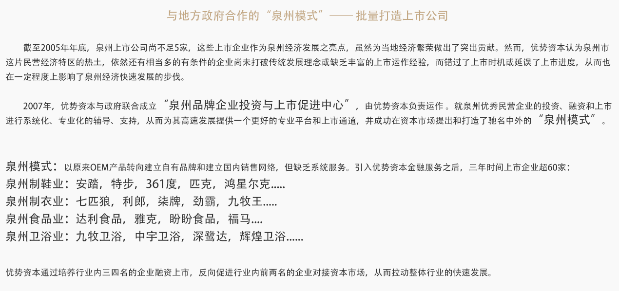 優(yōu)勢資本與地方政府合作成立的平臺,旨在給當(dāng)?shù)仄髽I(yè)提供包括資本培訓(xùn)、上市顧問服務(wù)、私募股權(quán)融資等金融與賦能服務(wù),為企業(yè)導(dǎo)入產(chǎn)業(yè)資源、科技資源,借助資本的力量進(jìn)行產(chǎn)業(yè)整合,推動具有企業(yè)家精神、經(jīng)營基礎(chǔ)良好的企業(yè)實現(xiàn)跨越式發(fā)展,并進(jìn)入資本市場。