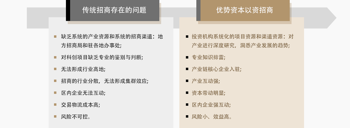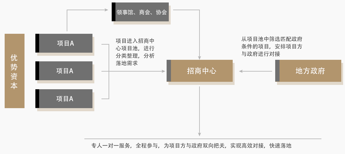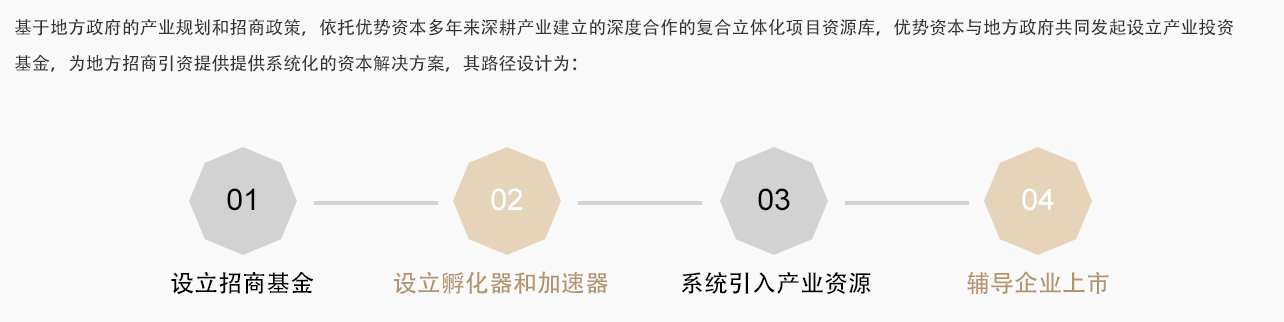 優(yōu)勢資本與政府共同成立招商中心,依托優(yōu)勢資本的產(chǎn)業(yè)資源項目庫和廣泛的資訊渠道,為地方政府進(jìn)行精準(zhǔn)招商。