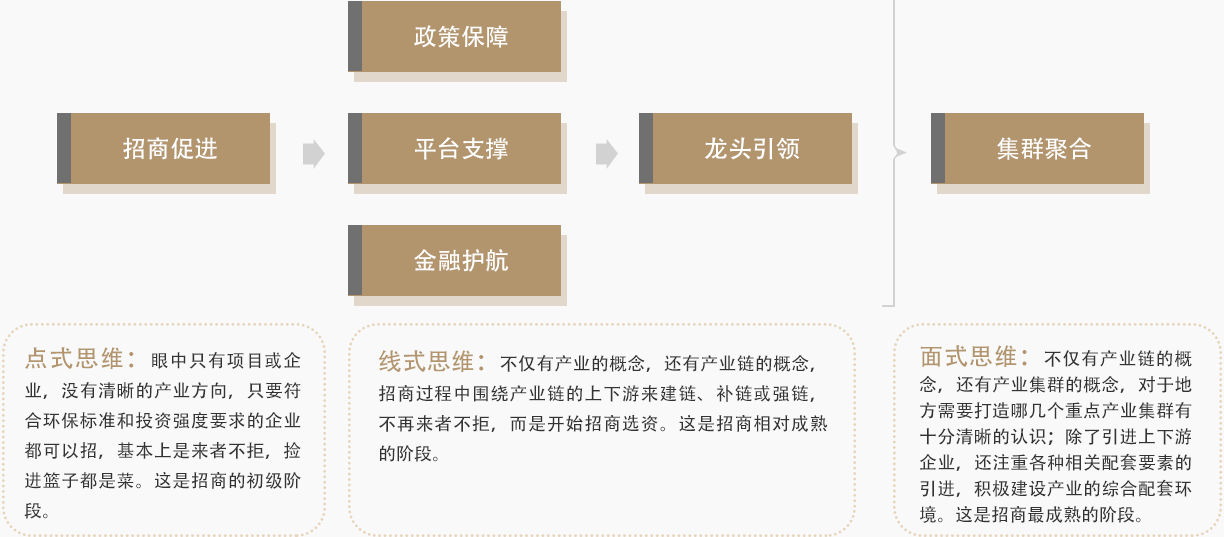 借助資本的力量,產(chǎn)業(yè)集群招商六步:招商促進(jìn)、政策保障、平臺支持、金融護(hù)航、龍頭引領(lǐng)、集群聚合。